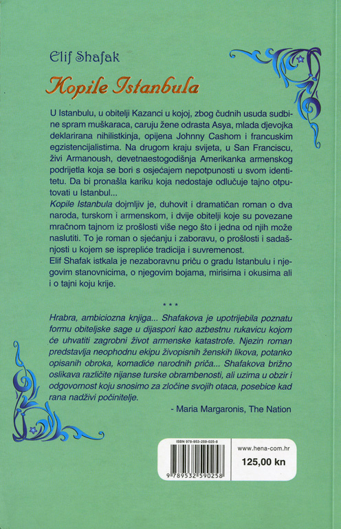 In a better world, Turkish writer Elif Shafak would get more attention for her zesty, imaginative writing and less for the controversy politics stir up. A lively look at conteporary Istanbul and family through the eye sof two young women, one Turkish and one Armenian American.